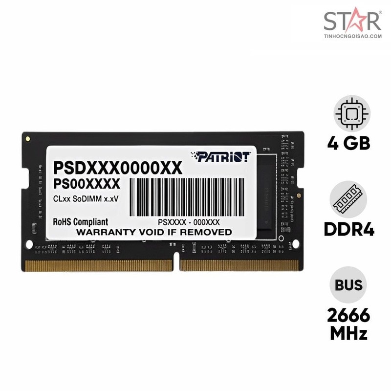 | Tên sản phẩm | RAM 4 LAPTOP 4G BUS 2666 PATRIOT (PSD44G266681S) KHÔNG TẢN NHIỆT |